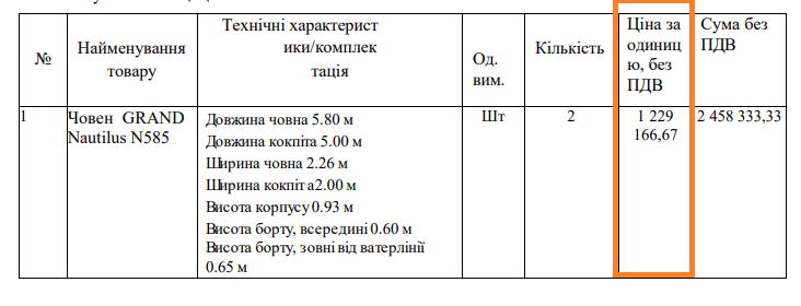26 серпня Комунальне підприємство ВИКОНАВЧОГО ОРГАНУ КИЇВСЬКОЇ МІСЬКОЇ РАДИ (КИЇВСЬКОЇ МІСЬКОЇ ДЕРЖАВНОЇ АДМІНІСТРАЦІЇ) ПО ОХОРОНІ, УТРИМАННЮ ТА ЕКСПЛУАТАЦІЇ ЗЕМЕЛЬ ВОДНОГО ФОНДУ М. КИЄВА “ПЛЕСО” провело закупівлю на два човни типу GRAND Nautilus N585 (або еквівалент), очікуваною вартістю у 3 000 000 гривень.