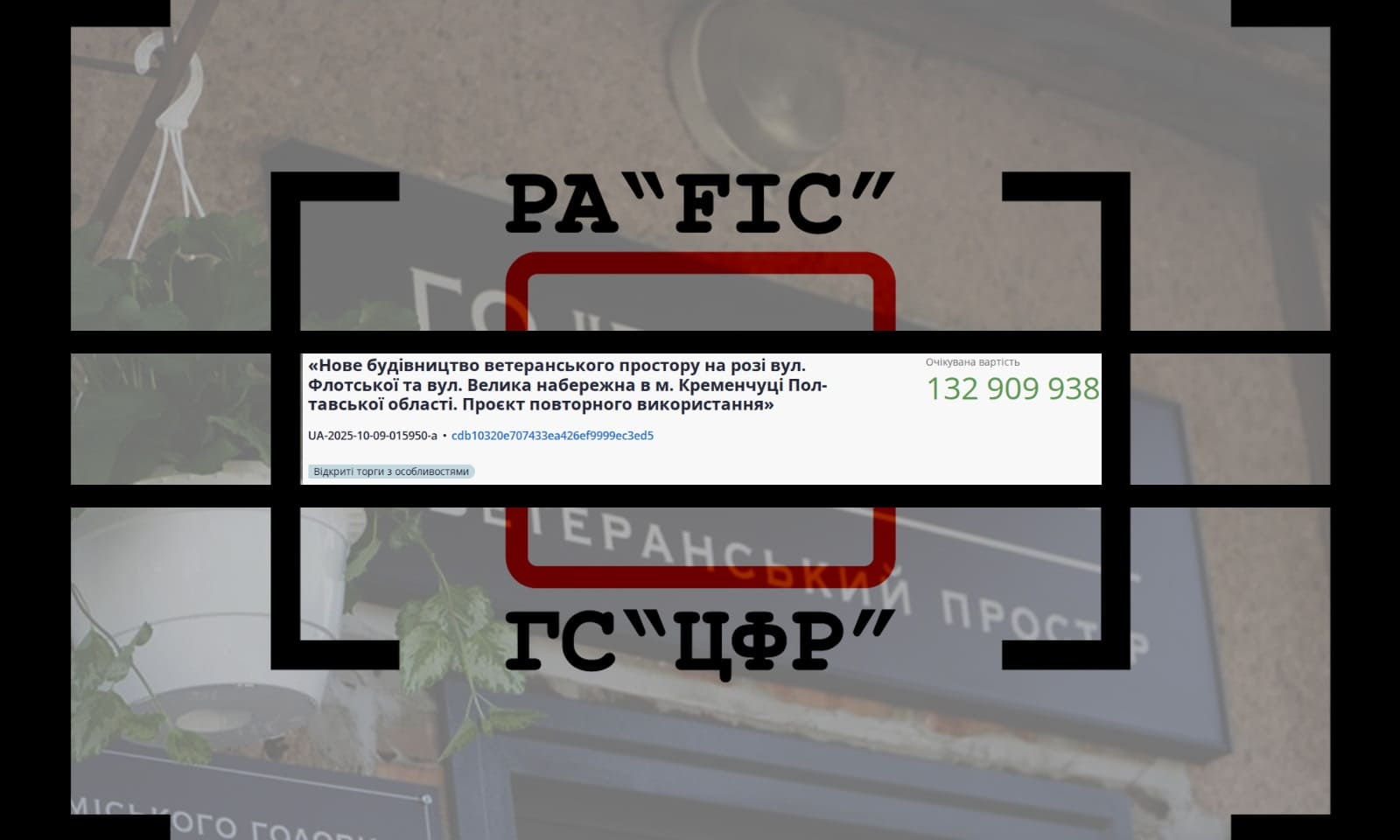 24 жовтня Виконавчий комітет Кременчуцької міської ради Кременчуцького району Полтавської області провело закупівлю на нове будівництво ветеранського простору на розі вул. Флотської та вул. Велика набережна в м. Кременчуці Полтавської області. Проєкт повторного використання.