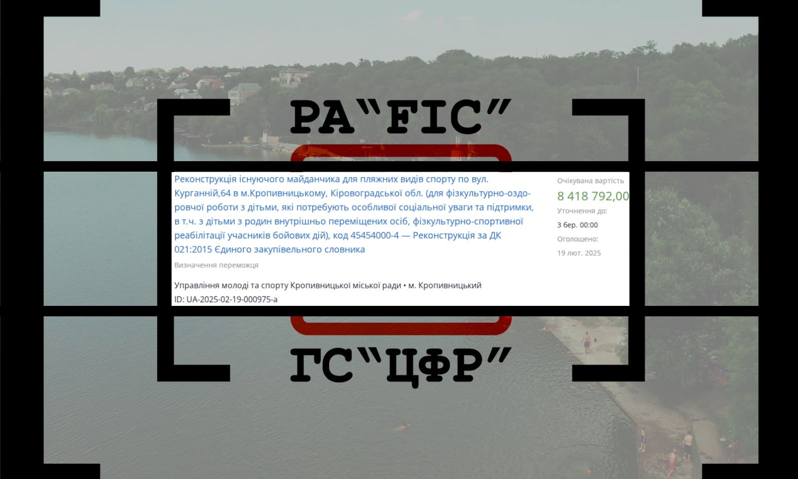 6 березня Управління молоді та спорту Кропивницької міської ради провело закупівлю на реконструкцію існуючого майданчика для пляжних видів спорту по вул. Курганній,64 в м. Кропивницькому, Кіровоградської обл. (для фізкультурно-оздоровчої роботи з дітьми, які потребують особливої соціальної уваги та підтримки, в т.ч. з дітьми з родин внутрішньо переміщених осіб, фізкультурно-спортивної реабілітації учасників бойових дій).