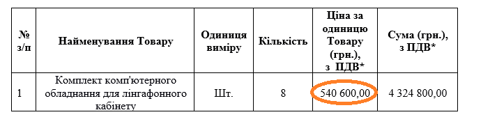 9 травня УПРАВЛІННЯ ОСВІТИ КРОПИВНИЦЬКОЇ МІСЬКОЇ РАДИ провело закупівлю на комплекти комп’ютерного обладнання для лінгафонного кабінету. 8 комплектів планують придбати з 4 326 400 гривень (місцевий бюджет).