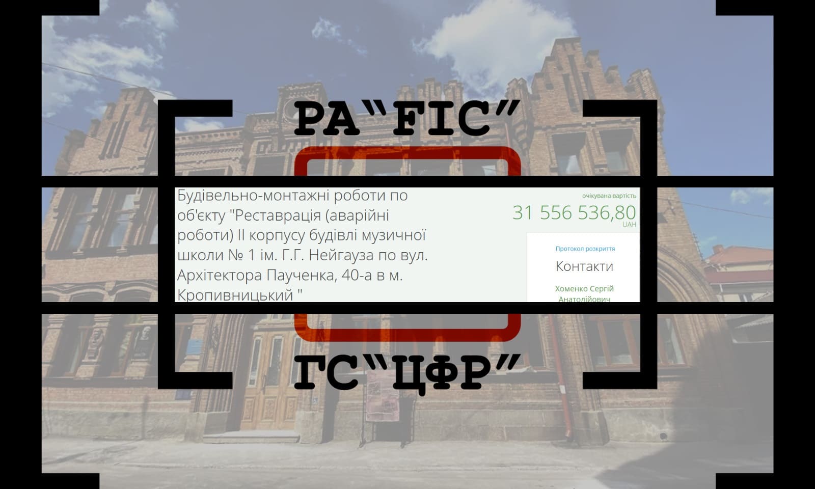 16 жовтня УПРАВЛІННЯ КАПІТАЛЬНОГО БУДІВНИЦТВА КРОПИВНИЦЬКОЇ МІСЬКОЇ РАДИ провело закупівлю на будівельнно-монтажні роботи по об’єкту “Реставрація (аварійні роботи) II корпусу будівлі музичної школи № 1 ім. Г.Г. Нейгауза по вул. Архітектора Паученка, 40-а в м. Кропивницький”.