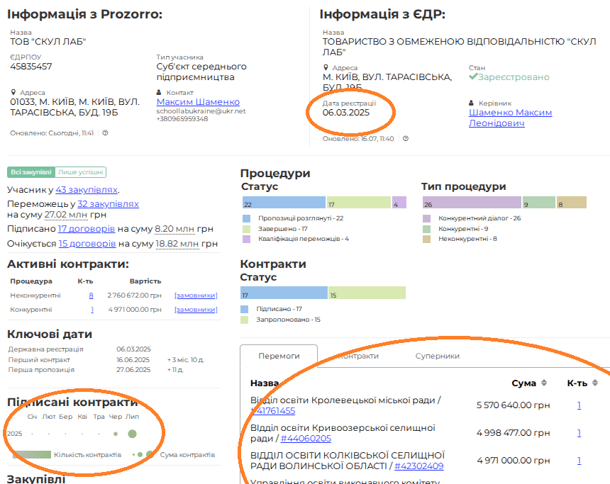 ТОВ зареєстрований у березні 2025 року. Має 17 договорів на 8 мільйонів гривень. Всі договори отримав у червні та липні 2025 року.