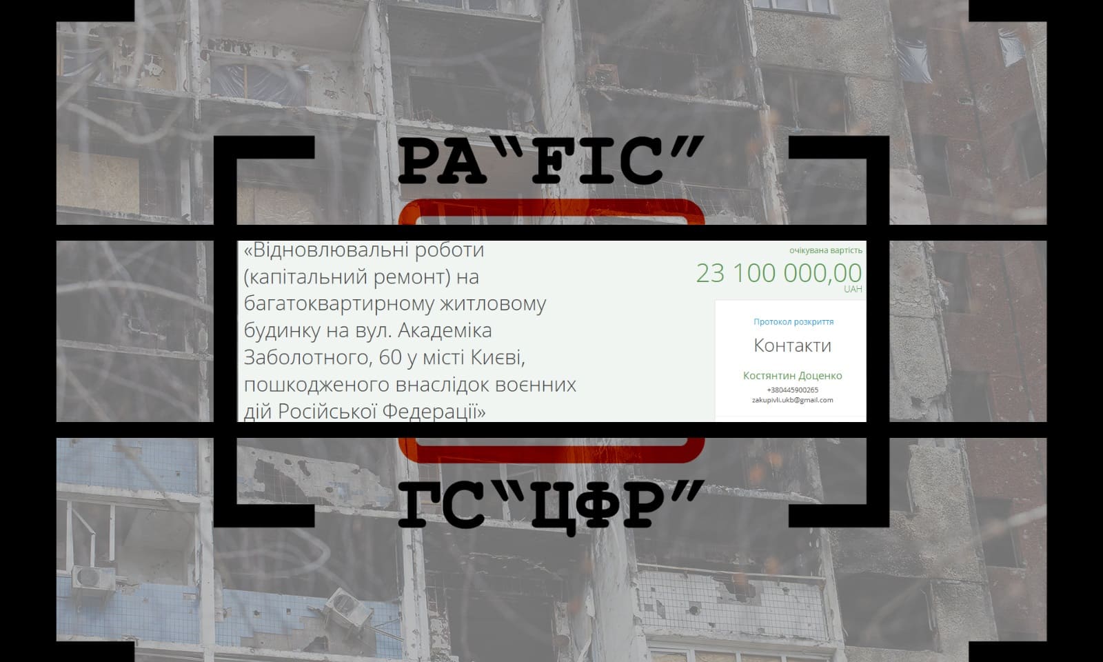 8 липня Комунальне підприємство з питань будівництва житлових будинків “Житлоінвестбуд-УКБ” провело закупівлю на капітальний ремонт на багатоквартирному житловому будинку на вул. Академіка Заболотного, 60 у місті Києві, пошкодженого внаслідок воєнних дій Російської Федерації.
