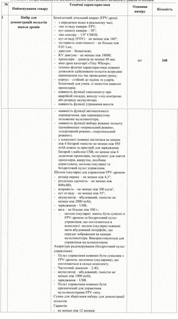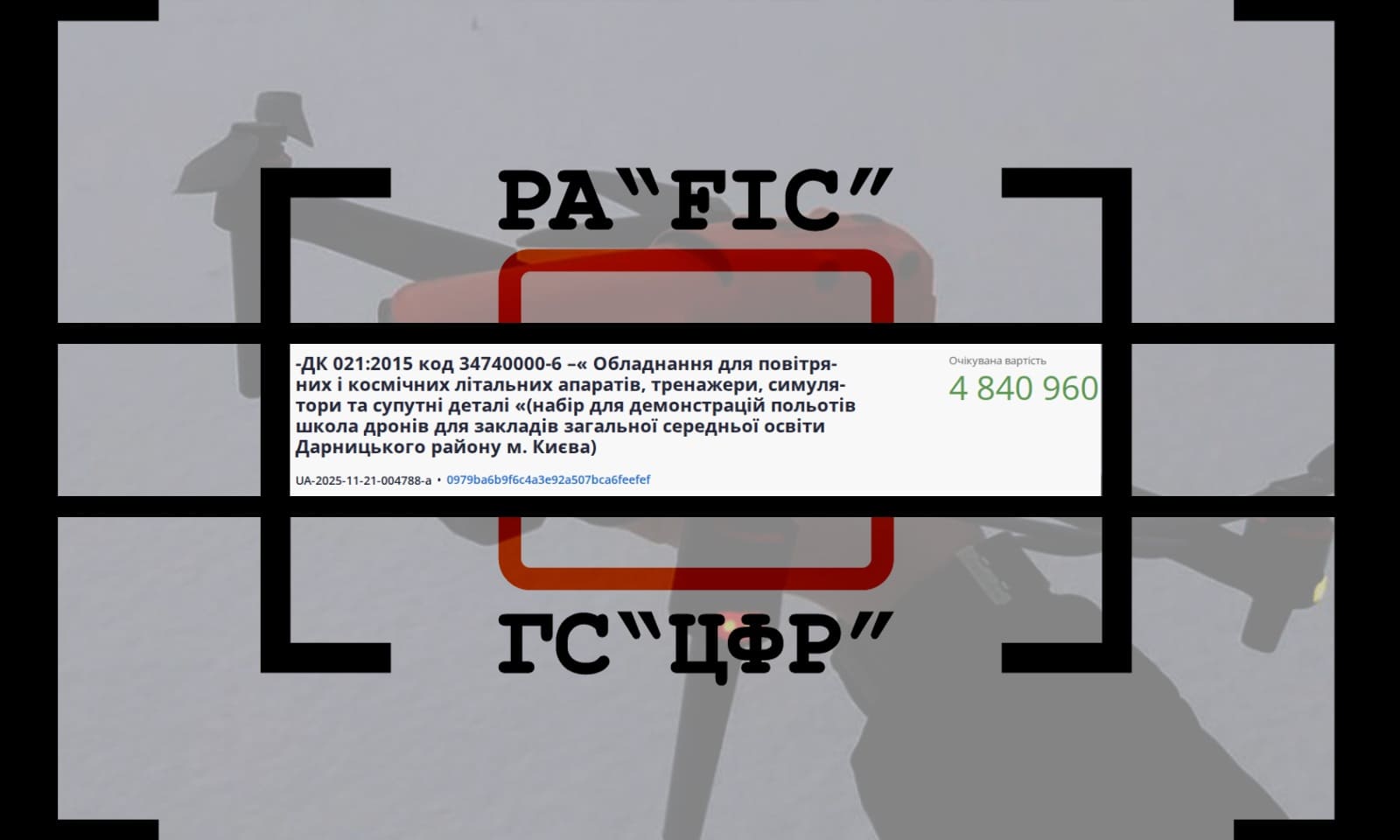1 грудня Управління освіти Дарницької районної в місті Києві державної адміністрації провело закупівлю на обладнання для повітряних і космічних літальних апаратів, тренажери, симулятори та супутні деталі (набір для демонстрацій польотів школа дронів для закладів загальної середньої освіти Дарницького району м. Києва).