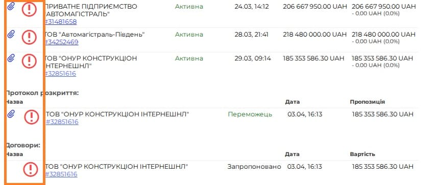 На торгах змагались три учасники, але система Clarity Project сигналізує про те, що всі три учасники торгів були пов’язані між собою: