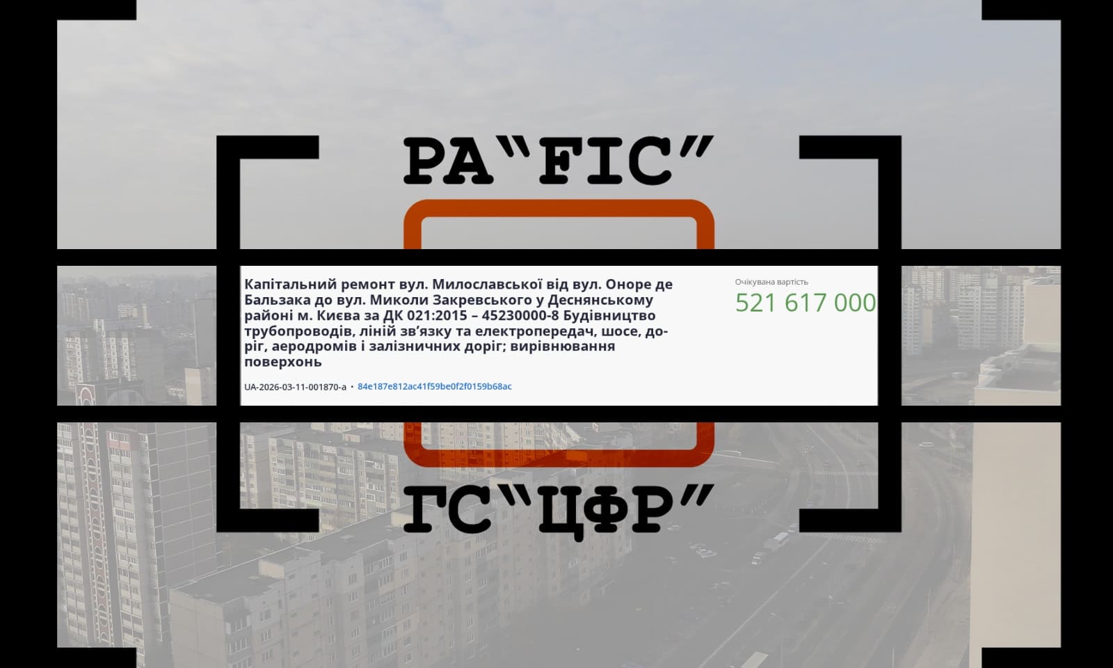1 квітня Комунальна корпорація “Київавтодор” провела закупівлю на капітальний ремонт вул. Милославської від вул. Оноре де Бальзака до вул. Миколи Закревського у Деснянському районі м. Києва.