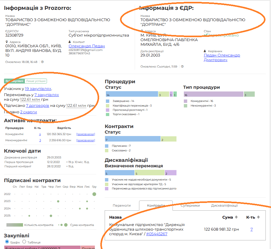 ТОВ існує з 2003 року. За цей час отримав 7 перемог на 122 мільйони гривень. Абсолютно всі контракти підписані з КП “Дирекція будівництва шляхово-транспортних споруд м. Києва”.