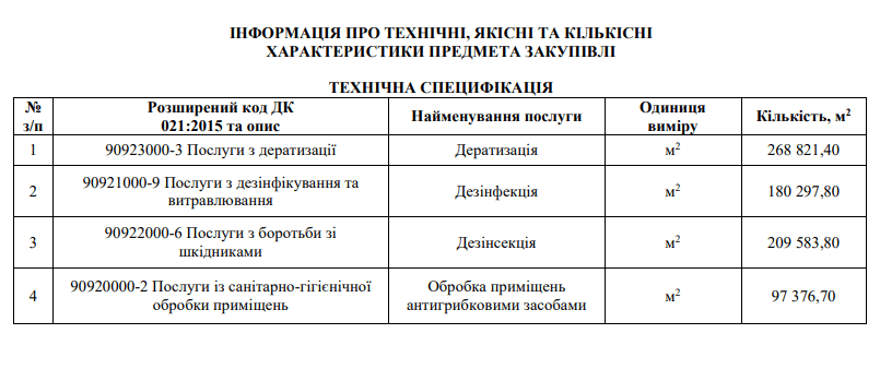 На торгах змагались п’ять учасників, переміг ТОВ “ПРОФ ДЕЗ КОНТРОЛЬ ПЛЮС” з пропозицією у 1 079 999 гривень.