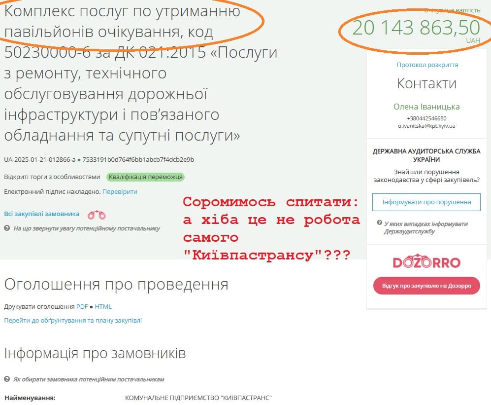 29 січня КОМУНАЛЬНЕ ПІДПРИЄМСТВО “КИЇВПАСТРАНС” провело закупівлю на комплекс послуг по утриманню павільйонів очікування за 20 143 863,5 гривні (кошти підприємства).