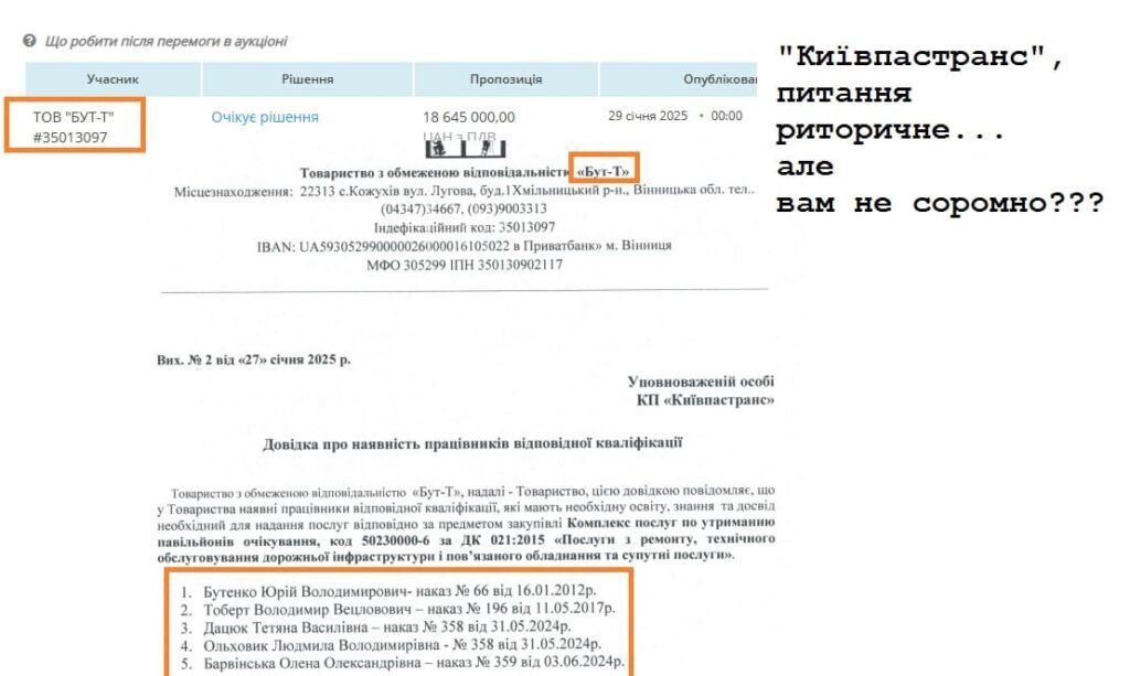 На торгах перемагає ТОВ “БУТ-Т” з села Кожухів, Вінницької області.