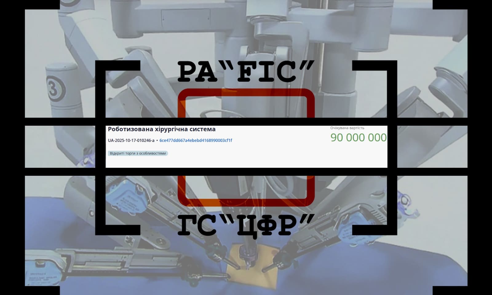 27 жовтня КОМУНАЛЬНЕ НЕКОМЕРЦІЙНЕ ПІДПРИЄМСТВО “КИЇВСЬКА МІСЬКА КЛІНІЧНА ЛІКАРНЯ №3” ВИКОНАВЧОГО ОРГАНУ КИЇВСЬКОЇ МІСЬКОЇ РАДИ (КИЇВСЬКОЇ МІСЬКОЇ ДЕРЖАВНОЇ АДМІНІСТРАЦІЇ) провело закупівлю на роботизовану хірургічну систему за 90 000 000 гривень.