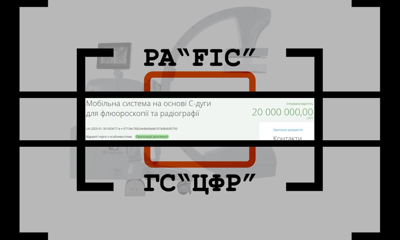 9 лютого КОМУНАЛЬНЕ НЕКОМЕРЦІЙНЕ ПІДПРИЄМСТВО “КИЇВСЬКА МІСЬКА КЛІНІЧНА ЛІКАРНЯ №3” ВИКОНАВЧОГО ОРГАНУ КИЇВСЬКОЇ МІСЬКОЇ РАДИ (КИЇВСЬКОЇ МІСЬКОЇ ДЕРЖАВНОЇ АДМІНІСТРАЦІЇ) провело закупівлю на мобільну систему на основі С-дуги для флюороскопії та радіографії.