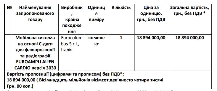 На торгах переміг єдиний учасник, ТОВ “ТОРГОВИЙ ДІМ ЕЛІТ-ЕДВАЙС”, з пропозицією у 18 894 000 гривень. За ці кошти ТОВ пропонує модель EUROAMPLI ALIEN CARDIO версія 3030 виробництва Eurocolum bus S.r.l., Італія.