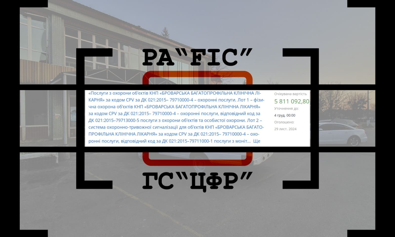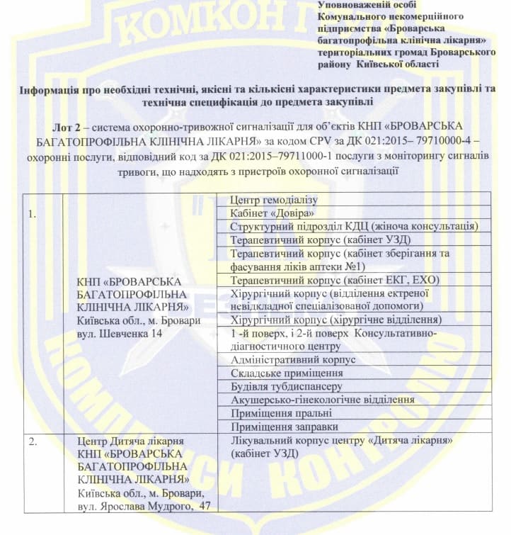 Закупівля складалась із двох лотів: фізична охорона об’єктів та система охоронно-тривожної сигналізації для об’єктів КНП.