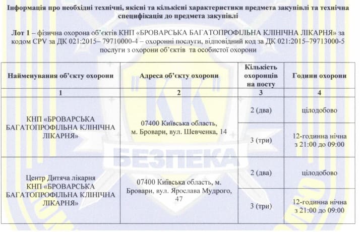 7 грудня КОМУНАЛЬНЕ НЕКОМЕРЦІЙНЕ ПІДПРИЄМСТВО “БРОВАРСЬКА БАГАТОПРОФІЛЬНА КЛІНІЧНА ЛІКАРНЯ” ТЕРИТОРІАЛЬНИХ ГРОМАД БРОВАРСЬКОГО РАЙОНУ КИЇВСЬКОЇ ОБЛАСТІ провело закупівлю на послуги з охорони об’єктів КНП.