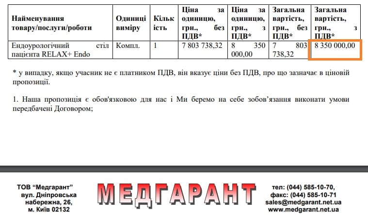 На торгах переміг єдиний учасник, ТОВ “Медгарант”, який вийшов чітко під запропоновану суму. Учасник пропонує стіл під назвою RELAX+ Endo, виробництва Dornier MedTech Americas.