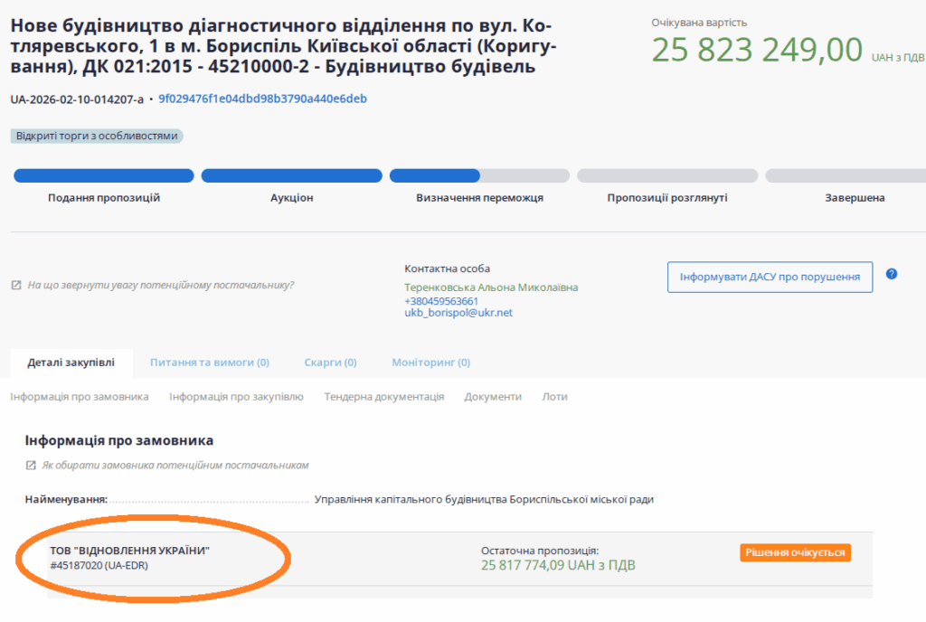 24 лютого Управління капітального будівництва Бориспільської міської ради провело закупівлю на нове будівництво діагностичного відділення по вул. Котляревського, 1 в м. Бориспіль Київської області (Коригування).
