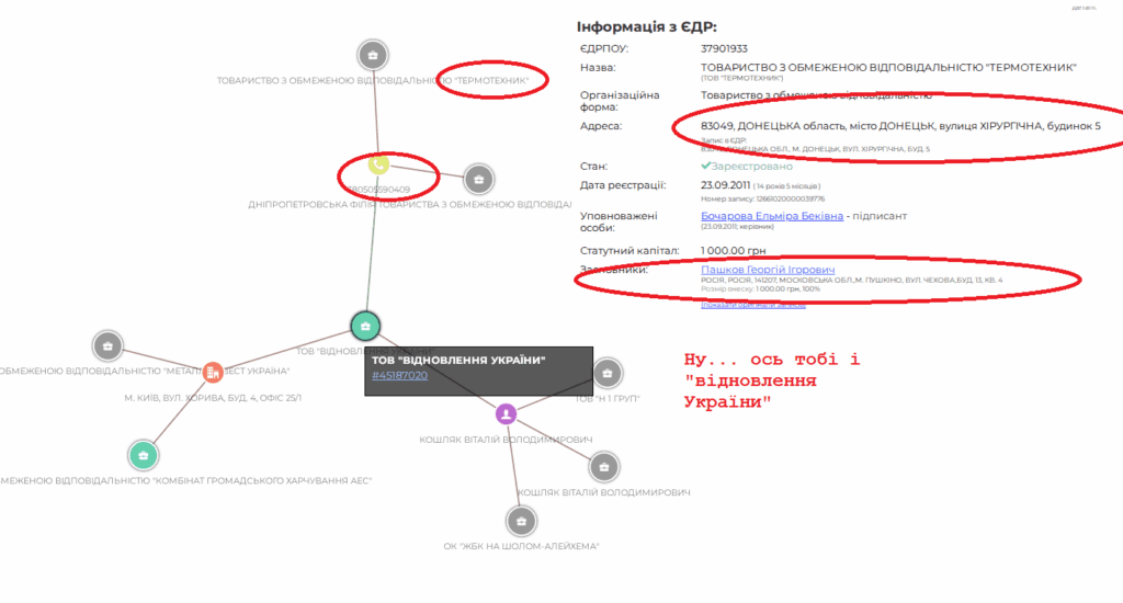 Дивно, що ТОВ “ВІДНОВЛЕННЯ УКРАЇНИ” вказує номер телефону +380505590409. З нього у 2024 році українцям телефонували спамери та пропонували фінансові послуги. А ще – номер належить донецькому ТОВу “Термотехник”, власником якого є громадянин рф Пашков. Якийсь дивний збіг.