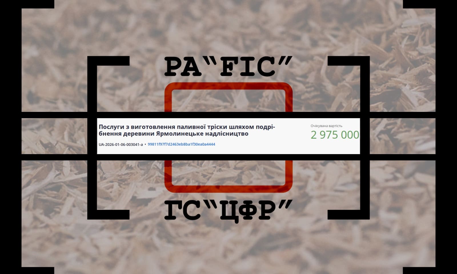 19 січня ФІЛІЯ “ПОДІЛЬСЬКИЙ ЛІСОВИЙ ОФІС” ДЕРЖАВНОГО СПЕЦІАЛІЗОВАНОГО ГОСПОДАРСЬКОГО ПІДПРИЄМСТВА “ЛІСИ УКРАЇНИ” провів закупівлю на послуги з виготовлення паливної тріски шляхом подрібнення деревини Ярмолинецьке надлісництво.