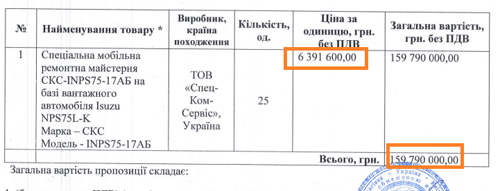 Департамент поліції особливого призначення “Об’єднана штурмова бригада Національної поліції України “Лють” провела закупівлю на спеціальні мобільні ремонтні автомайстерні, очікуваною вартістю 160 998 333 гривні.