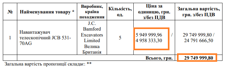 Окрім того, “ЛЮТЬ” закупить 5 телескопічних навантажувачів за 29 749 999,8 гривні у ТОВ “Констракшн Машинері”.