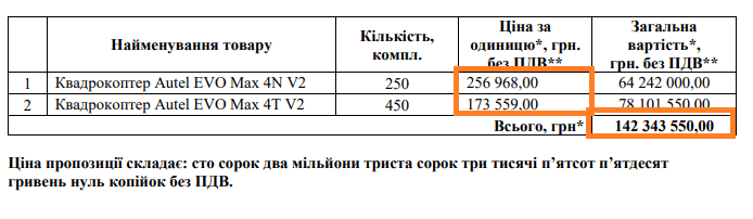 А 10 вересня відбулись ще одні подібні торги, бюджетом у 176 421 900 гривень. Тут замовник хоче купити квадрокоптер Autel EVO Max 4N V2 (250 комплектів) та квадрокоптер Autel EVO Max 4Т V2 (450 комплектів).