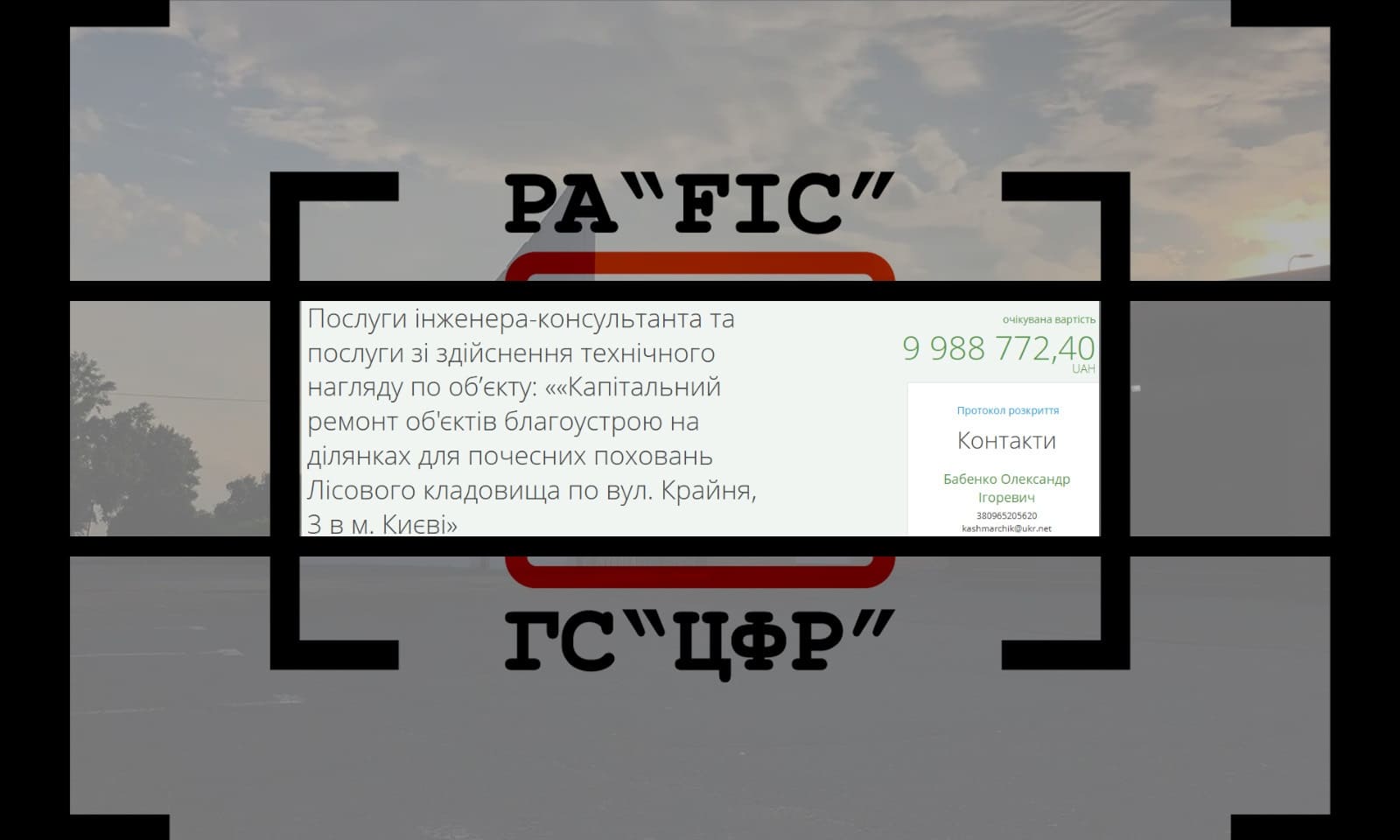 28 липня РИТУАЛЬНА СЛУЖБА СПЕЦІАЛІЗОВАНЕ КОМУНАЛЬНЕ ПІДПРИЄМСТВО “СПЕЦІАЛІЗОВАНИЙ КОМБІНАТ ПІДПРИЄМСТВ КОМУНАЛЬНО-ПОБУТОВОГО ОБСЛУГОВУВАННЯ” ВИКОНАВЧОГО ОРГАНУ КИЇВРАДИ (КИЇВСЬКОЇ МІСЬКОЇ ДЕРЖАВНОЇ АДМІНІСТРАЦІЇ) провела закупівлю на послуги інженера-консультанта та послуги зі здійснення технічного нагляду по об’єкту: “Капітальний ремонт об’єктів благоустрою на ділянках для почесних поховань Лісового кладовища”.
