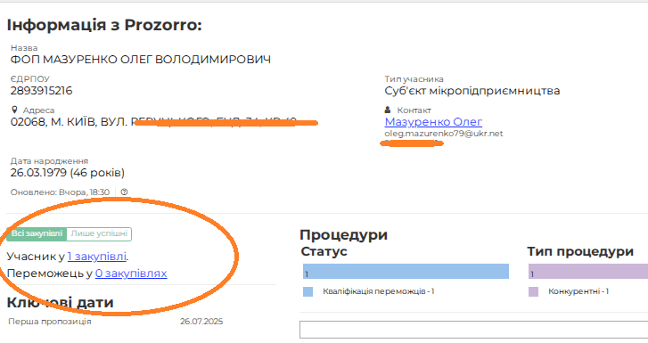 ФОП зареєстрований у 2019 році, але досі не мав жодної перемоги на торгах в Prozorro.