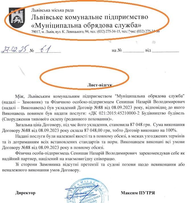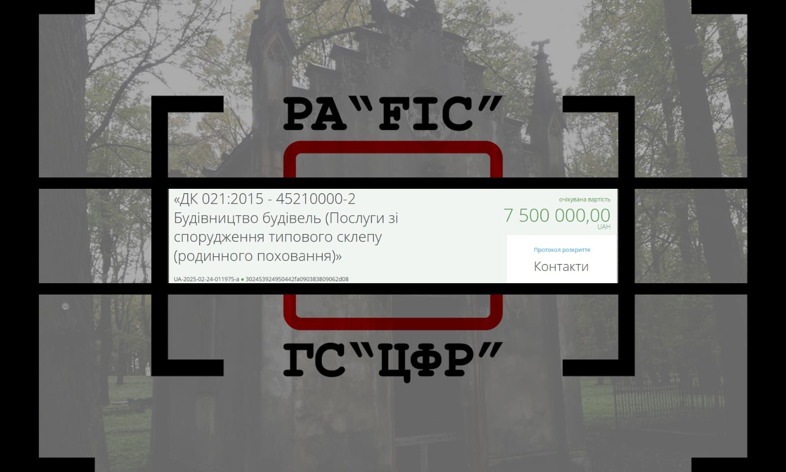 7 березня Львівське комунальне підприємство “Муніципальна обрядова служба” провело закупівлю на послуги зі спорудження типового склепу (родинного поховання). Очікувана вартість закупівлі склала 7 500 000 гривень (кошти від господарської діяльності підприємства).