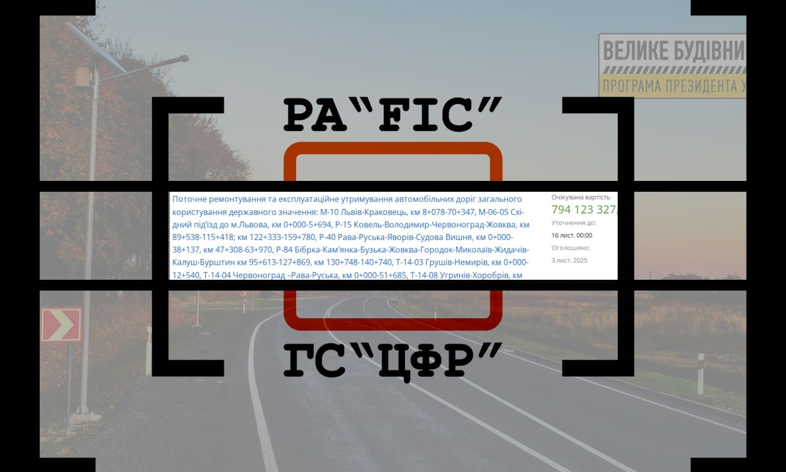 20 листопада СЛУЖБА ВІДНОВЛЕННЯ ТА РОЗВИТКУ ІНФРАСТРУКТУРИ У ЛЬВІВСЬКІЙ ОБЛАСТІ провела закупівлю на поточне ремонтування та експлуатаційне утримування автомобільних доріг загального користування державного значення: М-10 Львів-Краковець, км 8+078-70+347, М-06-05 Східний під’їзд до м. Львова, км 0+000-5+694, Р-15 Ковель-Володимир-Червоноград-Жовква, км 89+538-115+418; км 122+333-159+780, Р-40 Рава-Руська-Яворів-Судова Вишня, км 0+000-38+137, км 47+308-63+970, Р-84 Бібрка-Кам’янка-Бузька-Жовква-Городок-Миколаїв-Жидачів-Калуш-Бурштин км 95+613-127+869, км 130+748-140+740, Т-14-03 Грушів-Немирів, км 0+000-12+540, Т-14-04 Червоноград –Рава-Руська, км 0+000-51+685, Т-14-08 Угринів-Хоробрів, км 0+000-7+822, Т-14-14 Північний об’їзд м. Львова, км 0+000-4+637, Т-14-20 Яворів-Грушів, км 0+000-19+215, Львівської області (333,7 км).
