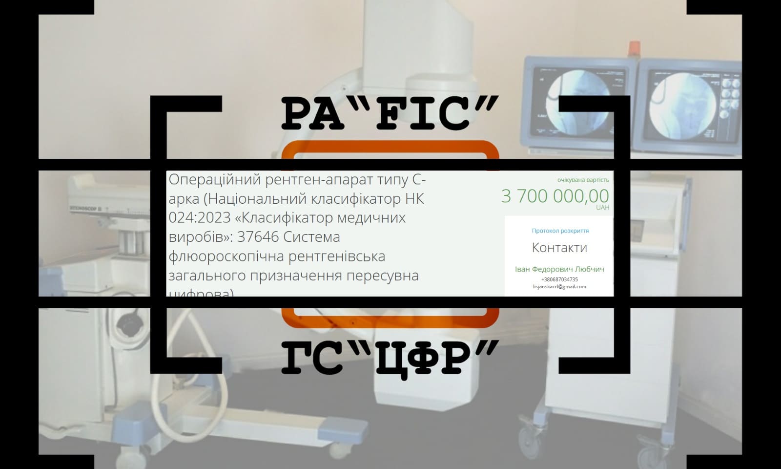 23 жовтня КОМУНАЛЬНЕ НЕКОМЕРЦІЙНЕ ПІДПРИЄМСТВО “ЛИСЯНСЬКА ТЕРИТОРІАЛЬНА ЛІКАРНЯ” ЛИСЯНСЬКОЇ СЕЛИЩНОЇ РАДИ ЧЕРКАСЬКОЇ ОБЛАСТІ провело торги на операційний рентген-апарат типу С-арка, очікуваною вартістю у 3 700 000 гривень (кошти НСЗУ).