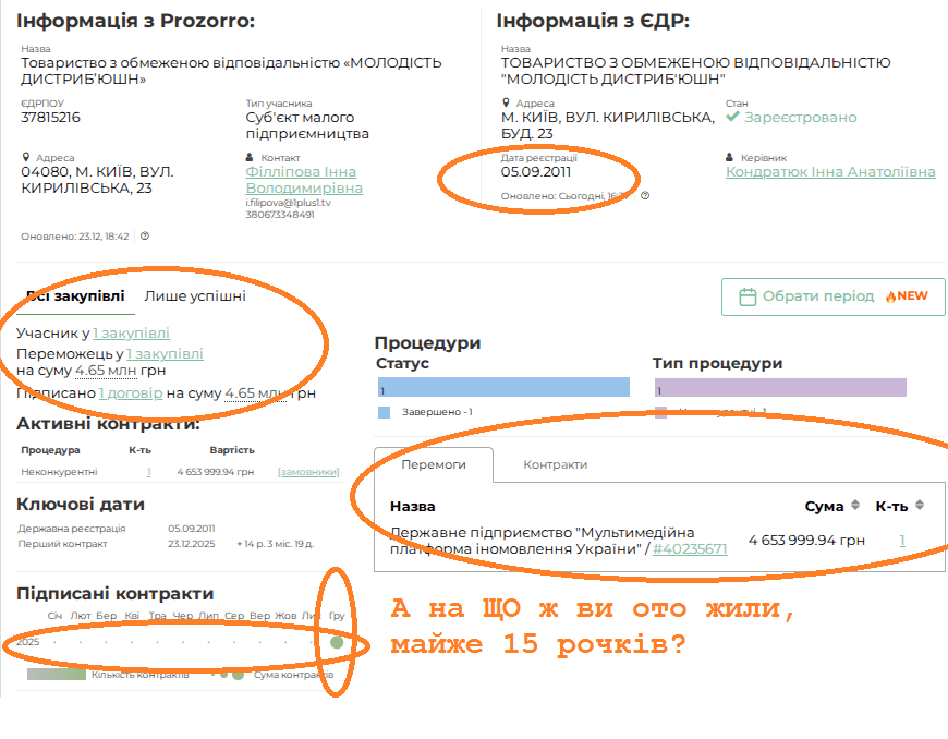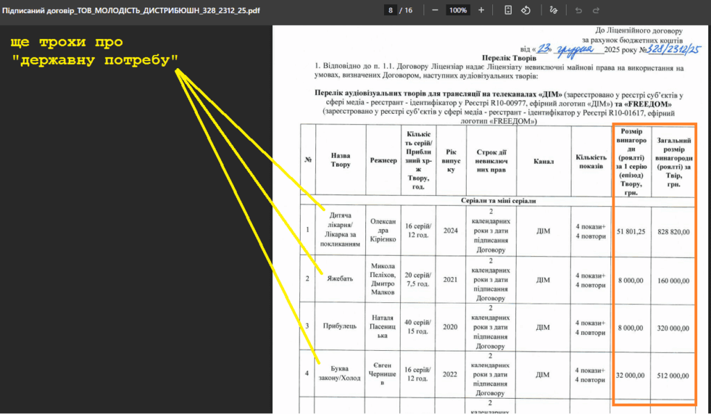 Ясна річ, спонсорується закупівля державним коштом. За цю суму на каналі “ДІМ” покажуть, наприклад, сітком “ЯЖЕБАТЬ”, “Прибулець”, “Весілля під час розведення” та багато іншого контенту виробництва “плюсів і ко” (з повним списком можна ознайомитись в договорі).