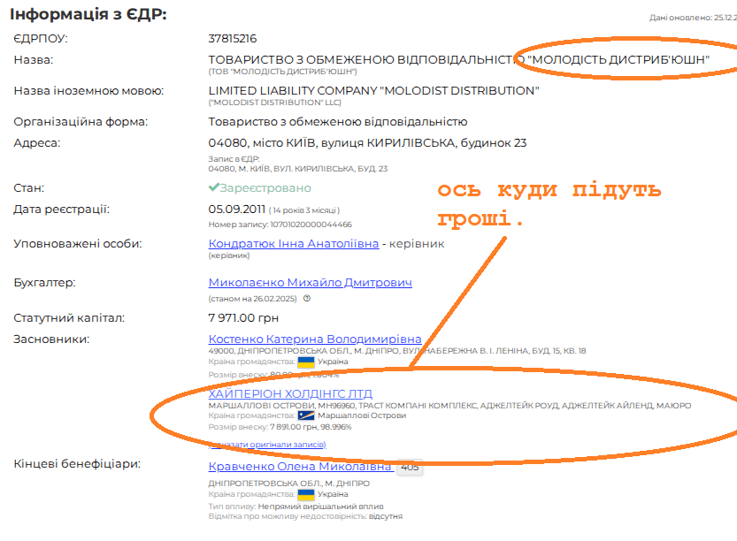 ТОВ “МОЛОДІСТЬ ДИСТРИБ’ЮШН” (наш щасливий переможець) разом з ТОВом “ЕНТРІ-7″(Беліз) є засновниками у ТОВу “МЕДІА-ЮГ”;