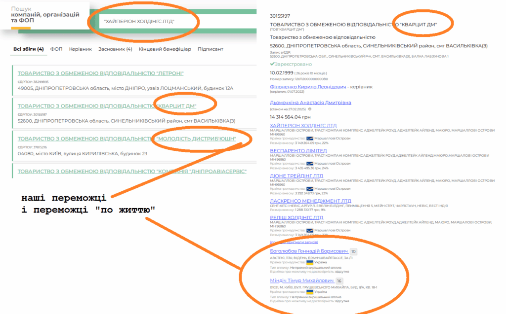 І тут нам дуже пощастило, бо зовсім недавно цю компанію у своїй публікації згадали NADRA.INFO. Справа в тому, що цей офшор також мав під своїм крилом ТОВ “Кварцит-ДМ”, котрому показали неприємний жест на Васильківському кар’єрі, і зупинили дію спецдозволу. Бо “Кварцит” це напряму Міндіч + Боголюбов. Ну і наша “маршаллівська” оболонка (посилання на матеріал).