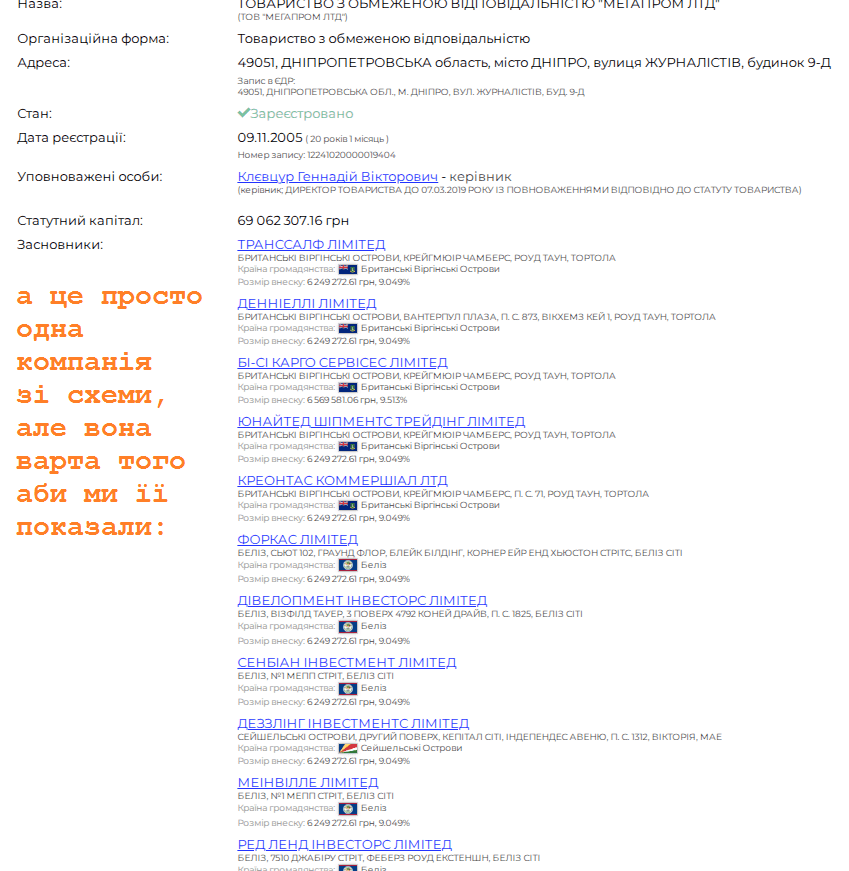 ТОВ “РІА-ЛІЗИНГ”, у свою чергу, є засновником ще у п’яти контор. Обираємо з цього списку ТОВ “МЕГАПРОМ ЛТД”…і потрапляємо відразу аж на 11 офшорних компаній-власників у Белізі, Сейшелах та Віргінських островах.