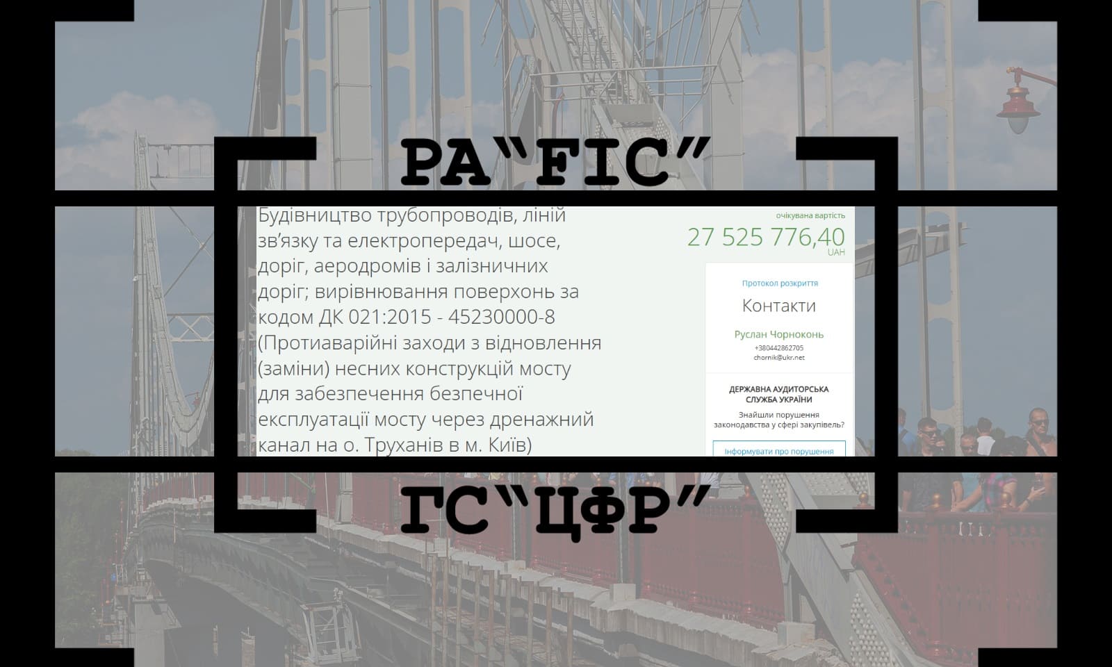 15 січня Комунальне підприємство по ремонту і утриманню мостів і шляхів м. Києва “Київавтошляхміст” провів закупівлю на протиаварійні заходи з відновлення (заміни) несних конструкцій мосту для забезпечення безпечної експлуатації мосту через дренажний канал на о. Труханів в м. Київ. Очікувана вартість закупівлі склала 27 525 776,4 гривні (місцевий бюджет).