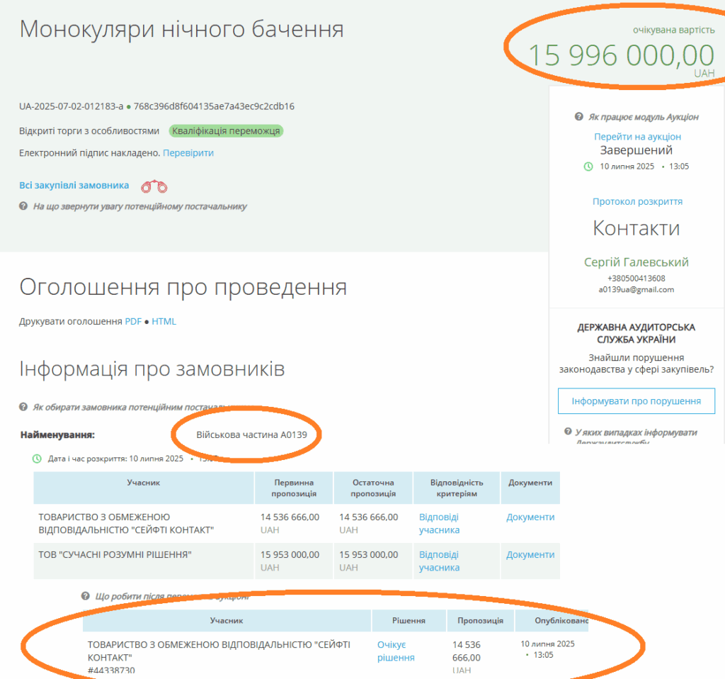 Але, схоже, контракт отримає інший учасник ТОВ “СЕЙФТІ КОНТАКТ”, з пропозицією у 14 536 666 гривень (монокуляр Diana M40 виробництва болгарської компанії Optix Co).