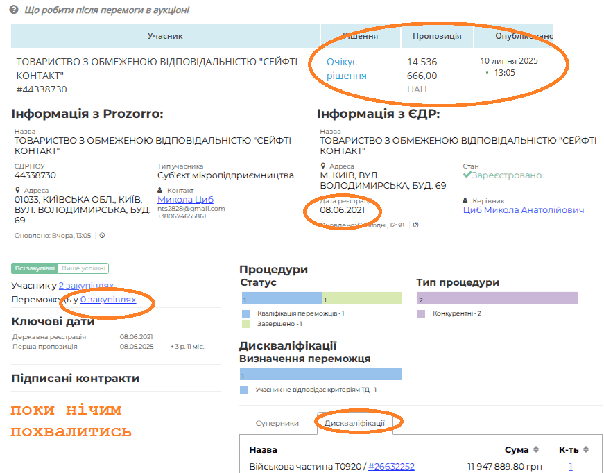 ТОВ існує з 2021 року. Має статутний капітал у розмірі 7 950 гривень, одну штатну одиницю (остання звітність за 2024 рік) і жодного контракта на Prozorro. В квітні цього року претендувала на контракт в 11 мільйонів від ВЧ Т0920 (також монокуляри), але пропозиція учасника була відхилена. Причина: військова частина вимагала обладнання чітко зазначеної марки.