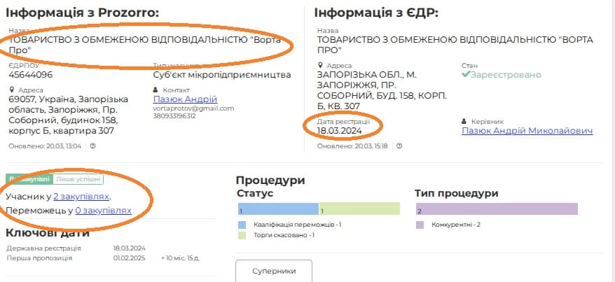 ТОВ засновано в березні 2024 року в Запоріжжі. Досі контрактів у Prozorro не мав.