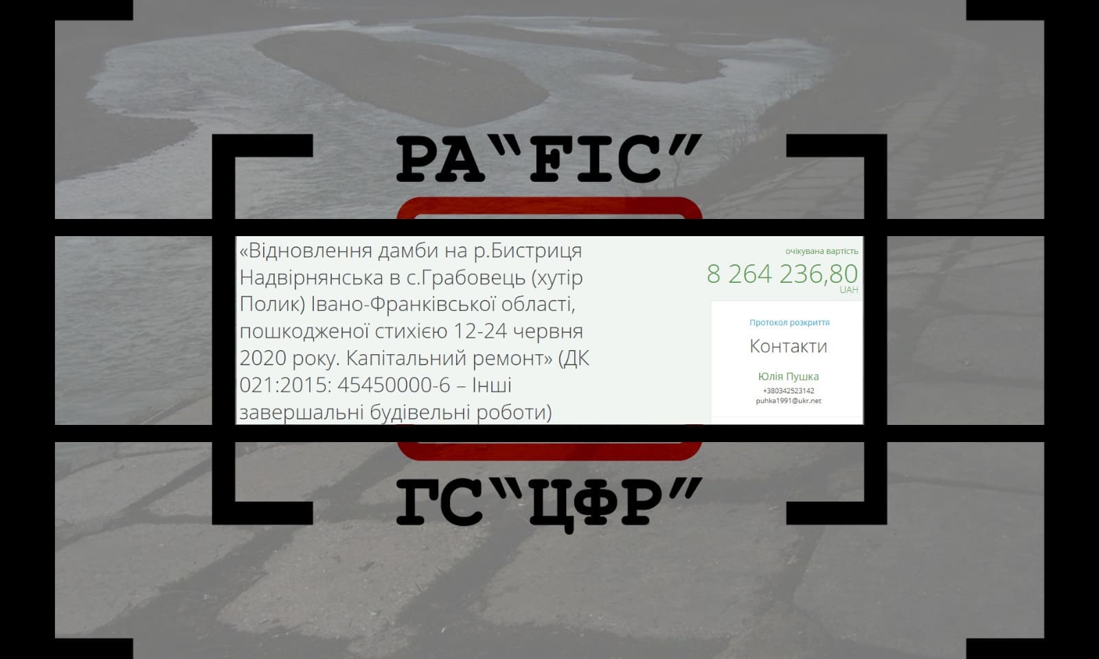 Ще за 8 264 236,8 гривні провели закупівлю на відновлення дамби на р. Бистриця Надвірнянська в с. Грабовець (хутір Полик) Івано-Франківської області, пошкодженої стихією 12-24 червня 2020 року. Фінальна вартість склала 8 247 312 гривень.