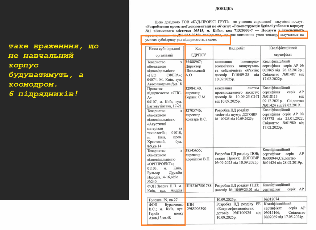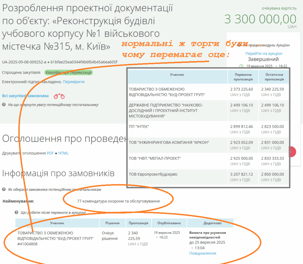 19 вересня 77 комендатура охорони та обслуговування провела закупівлю на розроблення проектної документації по об’єкту: “Реконструкція будівлі учбового корпусу №1 військового містечка №315, м. Київ”. Вартість – 3 300 000 гривень.