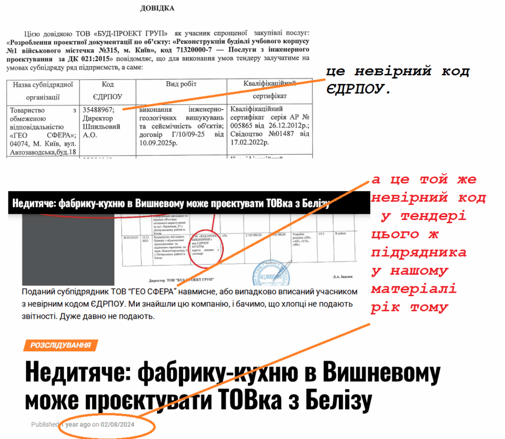 Тут ми трохи ще й посміялись. Найголовнішим субпідрядником, як і рік тому, вписали ТОВ “ГЕО СФЕРУ”, і знову зробили це криворуко. Як і минулого року в Вишневому, не змогли (або не захотіли) внести коректний код ЄДРПОУ.