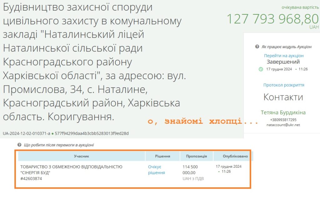 Переміг ТОВ “СІНЕРГІЯ БУД” буд з пропозицією у 114 500 000 гривень.