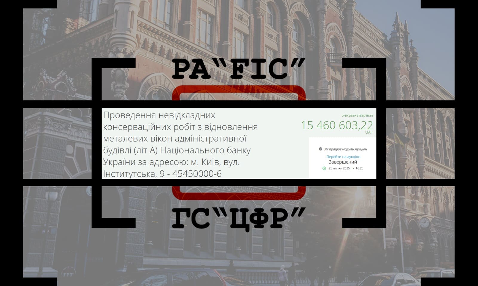 Проведення невідкладних консерваційних робіт із заміни пошкоджених віконних блоків адміністративної будівлі (літ. А) Національного банку України за адресою: м. Київ, вул. Інститутська, 9 оцінили у 17 840 110,38 гривні.