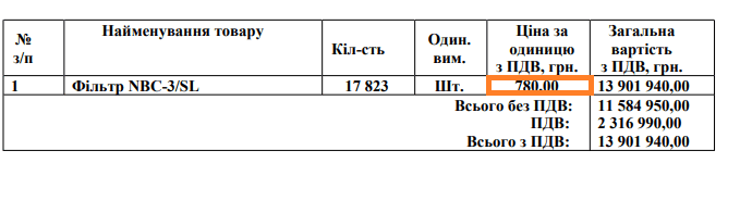 28 травня Державна установа “Центр обслуговування підрозділів Національної поліції України” провела закупівлю на фільтри до протигазів. Очікувана вартість 17823 штук склала 19 222 105 гривень.