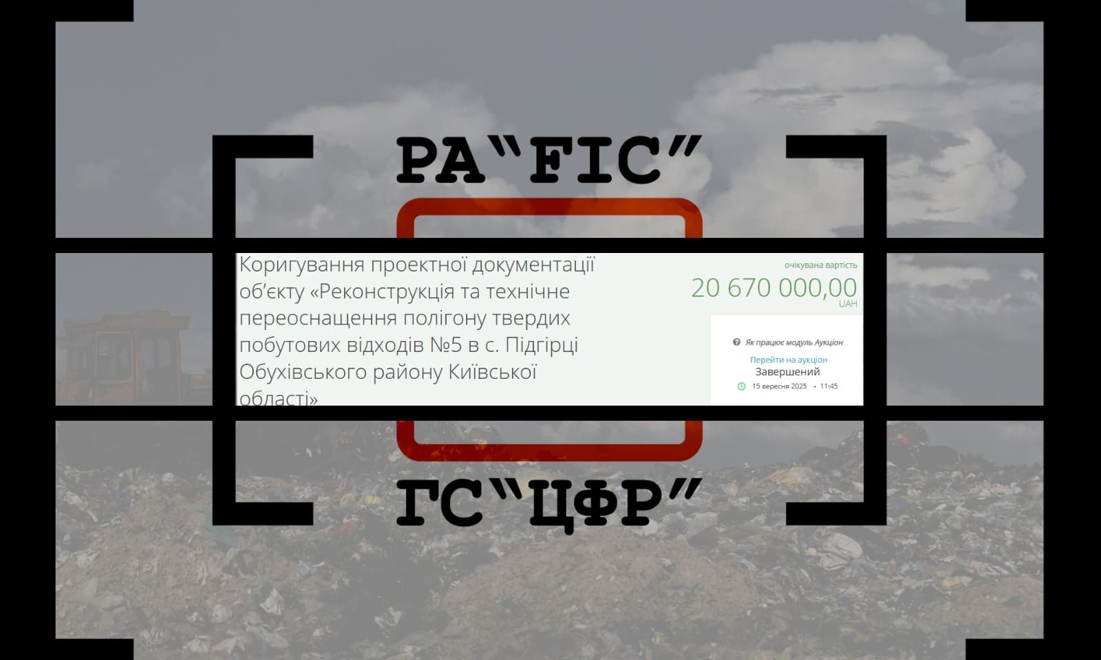 15 вересня Приватне акціонерне товариство “Київспецтранс” провело закупівлю на коригування проектної документації об’єкту “Реконструкція та технічне переоснащення полігону твердих побутових відходів №5 в с. Підгірці Обухівського району Київської області”.