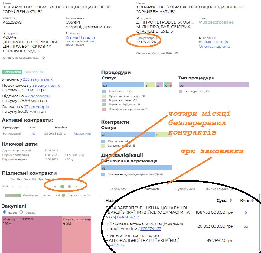 Дивно так виходить. Компанія існує з травня 2024 року, а контракти пішли з липня 2025 року…при чому, безперервним потоком. За чотири місяці ТОВ ОРАЙЗЕН АКТИВ” вже підписав 42 договори на 128 мільйонів гривень. Цікаво, що працює виключно з трьома замовниками: ВЧ 3075 (6 договорів на 108 мільйонів), ВЧ 3078 (35 договорів на 20 мільйонів) та ВЧ 3101 (1 договір на 199 тисяч гривень).