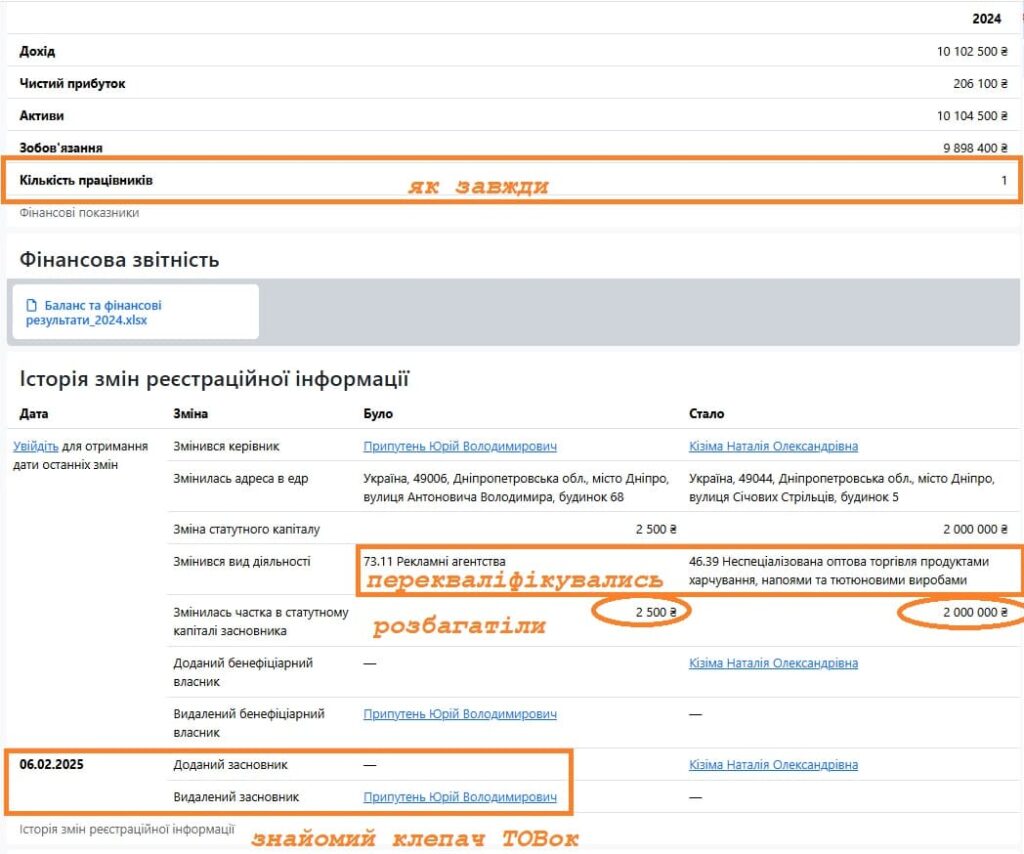 Мова йде про ТОВ “ОРАЙЗЕН АКТИВ” з Дніпра. Компанія зареєстрована 17 травня 2024 року як така, що надаватиме рекламні послуги. Але в лютому 2025 року щось різко змінилось, і ТОВ змінює вид діяльності на 46.39 Неспеціалізована оптова торгівля продуктами харчування, напоями та тютюновими виробами.