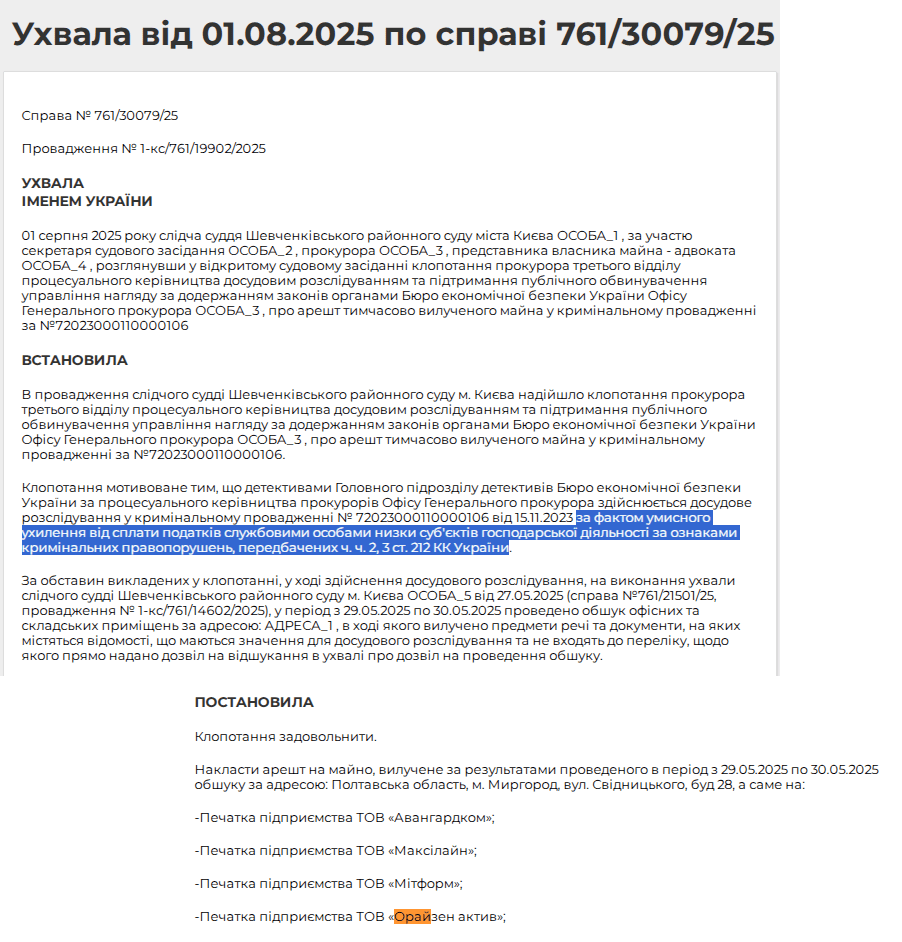 А от 1 серпня про ОРАЙЗЕН АКТИВ” вже згадується в справі 761/30079/25. Слухають її за клопотанням прокурора за фактом умисного ухилення від сплати податків службовими особами низки суб’єктів господарської діяльності за ознаками кримінальних правопорушень, передбачених ч. ч. 2, 3 ст. 212 КК України.