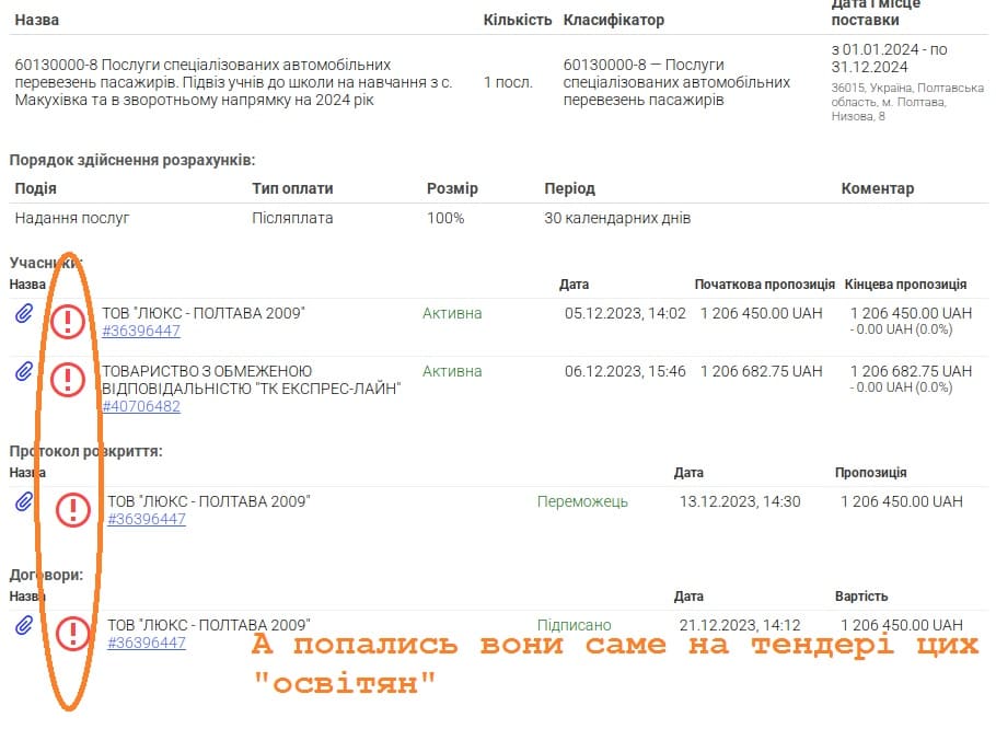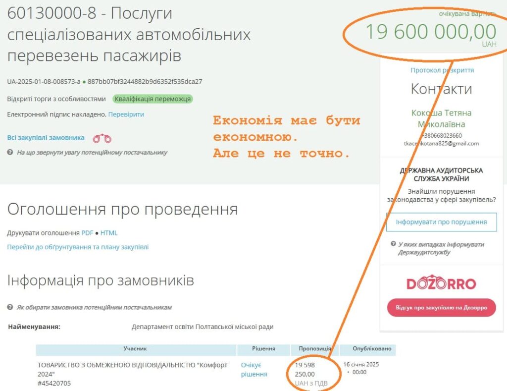 16 січня Департамент освіти Полтавської міської ради провів закупівлю на послуги спеціалізованих автомобільних перевезень пасажирів, очікуваною вартістю у 19 600 000 гривень (100% місцевий бюджет).